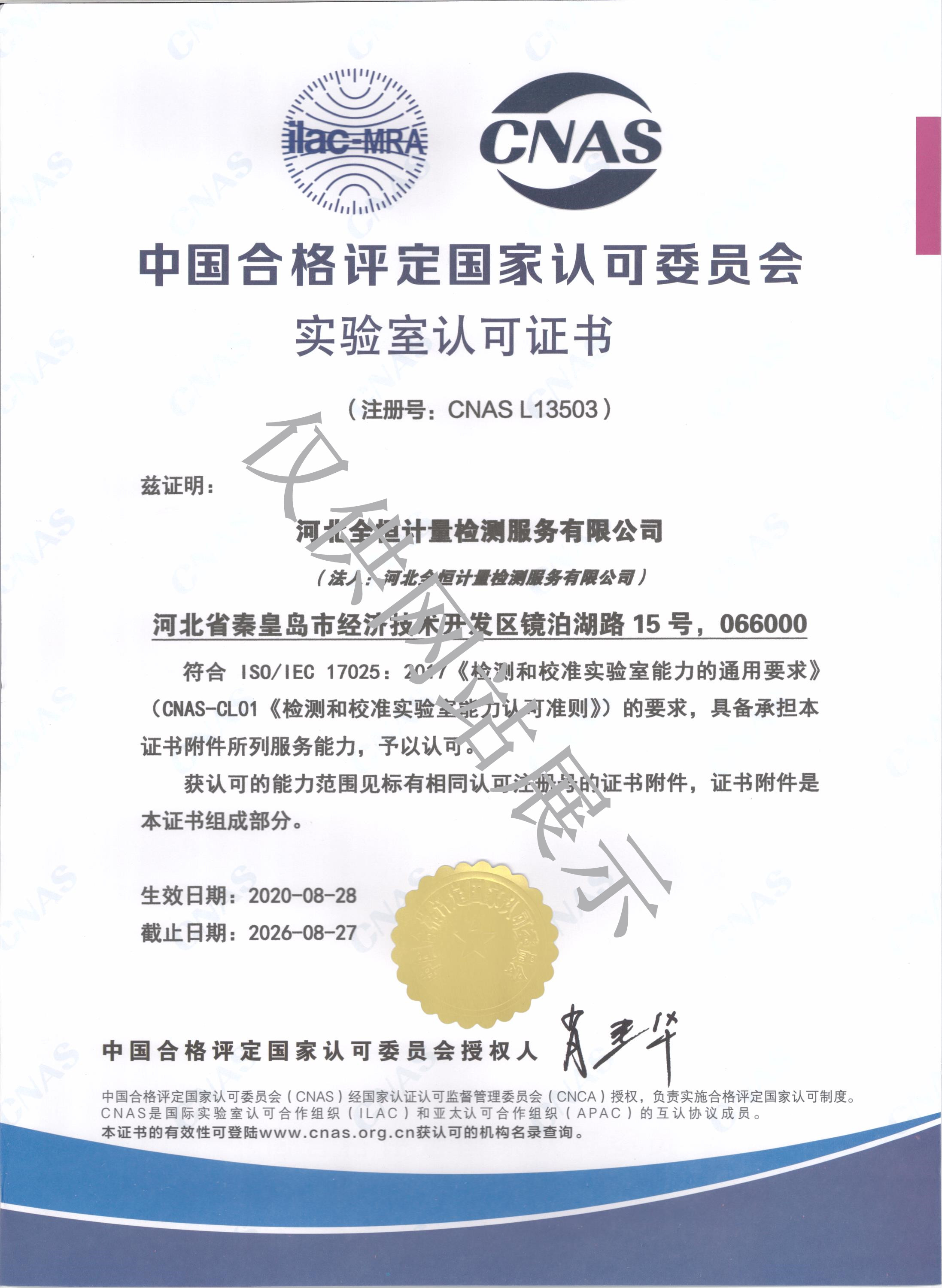 中國(guó)合格評(píng)定國(guó)家認(rèn)可委員會(huì)實(shí)驗(yàn)室認(rèn)可證書(shū)